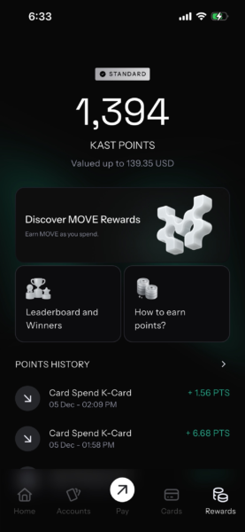 You will also find a rewards section for the card. Many crypto cards these days offer cashback with different rates. KAST claims to offer cashback as well but it’s not an actual cashback, at least not in the conventional sense. What it does is that it gives you points for card usage and the points are supposed to be redeemed for actual KAST tokens at a later date. This is a risk you have to be aware of since you’re not getting actual cashback but rather points which may or may not be worth anything at a future date.