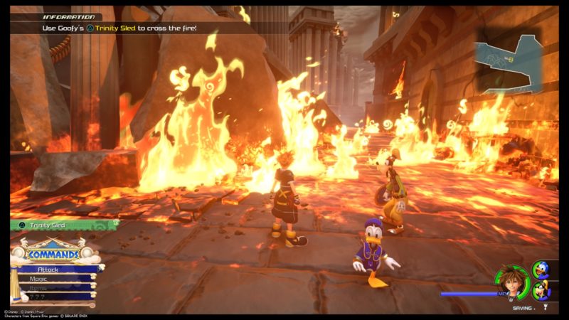 You will then reach a place where there is fire all around. Goofy will suggest using his shield to slide through. It will be a normal feature hereon.